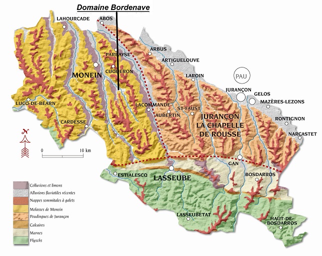 Nos vignes sont plantées sur le versant sud et ouest des pentes du piémont pyrénéen sur des sols argilo-limoneux, riches en galets roulés, portés par les torrents et glaciers pyrénéens. Ces sols, possédant la pauvreté requise ainsi qu'une excellente régulation hydrique, favorisent l'enracinement profond de la vigne.